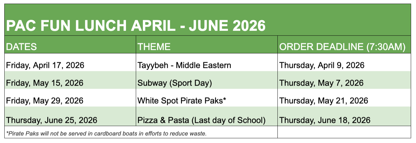 Volunteer: Our PAC Fun Lunch program can only run if we have parent volunteers to help out. An average hot lunch takes about 6-8 volunteers, and shifts last around 1 hour. If you can help occasionally, please complete this FORM to add yourself to our volunteer list.